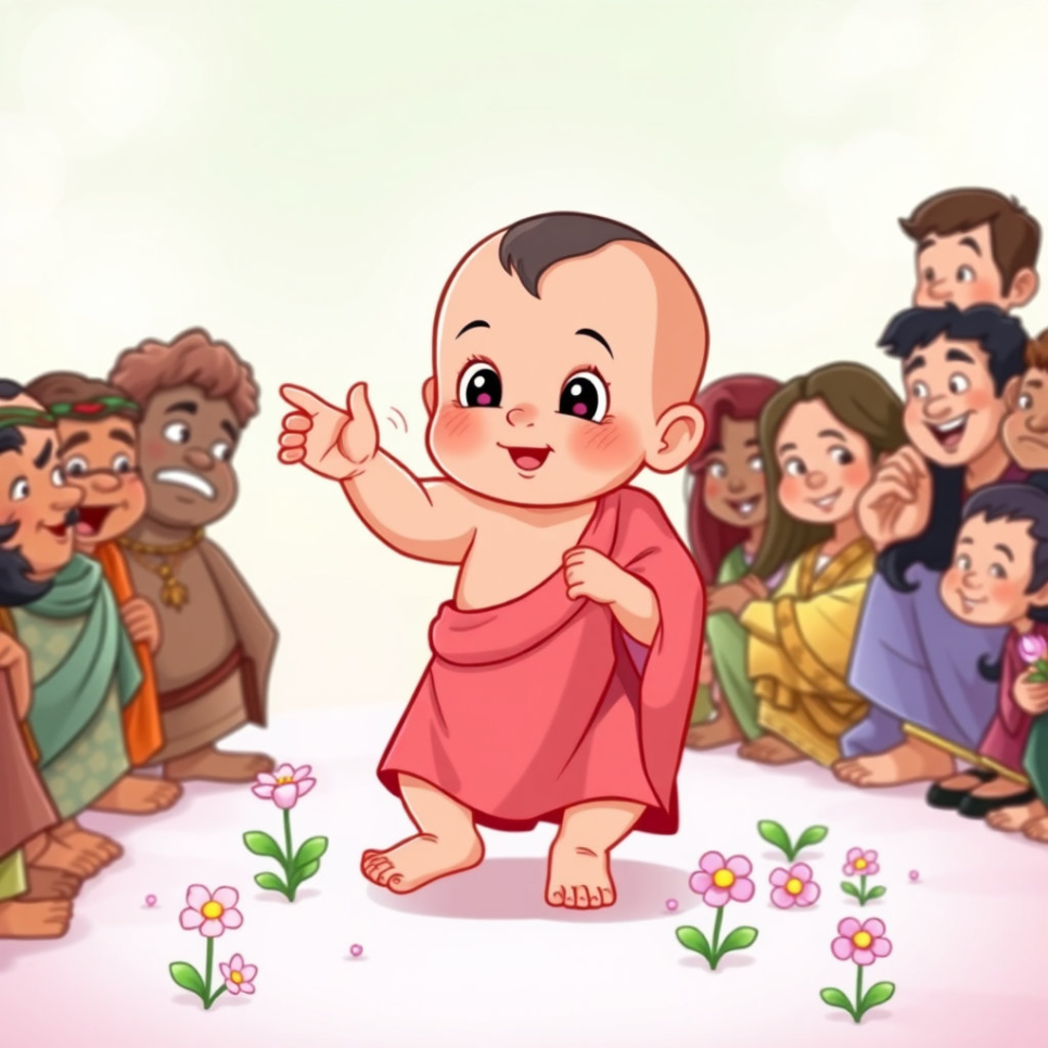 갓 태어난 아기 싯다르타에게는 아주 특별한 일이 일어났어요. 보통 아기들은 엄마 품에 안겨 세상을 처음 바라보지만, 싯다르타는 태어나자마자 놀랍게도 일곱 걸음을 또박또박 걸어간 거예요! 그리고 걸음을 멈춘 자리에서 한 손은 하늘을 가리키고, 다른 한 손은 땅을 가리키며 이렇게 외쳤다고 전해진답니다. "천상천하 유아독존!"