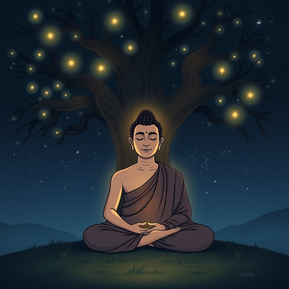 오랜 수행 끝에 싯다르타는 보리수라는 커다란 나무 아래에 자리를 잡고 깊은 명상에 들어갔습니다. 그는 온 마음과 정성을 다해 진리를 탐구했고, 마침내 밤하늘의 별이 가장 밝게 빛나는 순간, 세상의 모든 이치를 환하게 깨닫게 되었습니다! 그의 마음은 마치 오랫동안 닫혀 있던 문이 활짝 열린 것처럼, 세상의 모든 지혜와 자비로 가득 차게 되었죠.