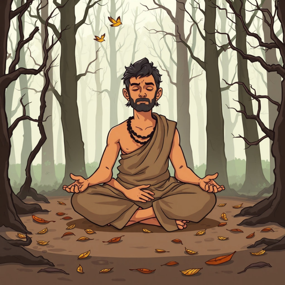 싯다르타가 숲속에서 고행하며 진리를 탐구하는 모습.