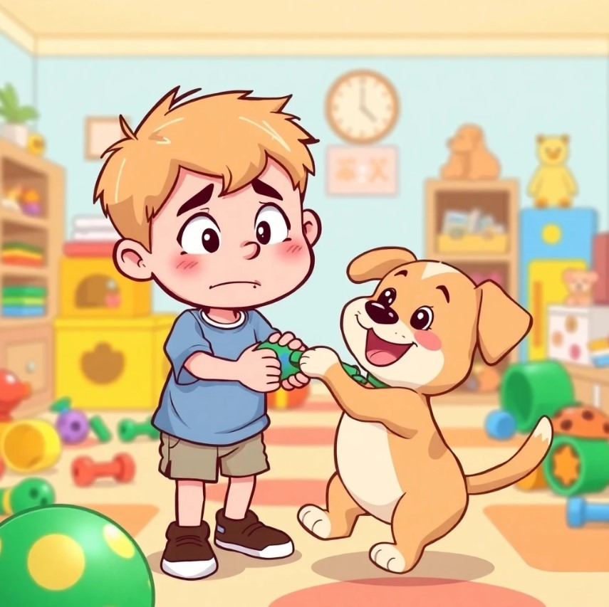 어느 날, 강아지가 민우의 장난감을 물어와서 민우는 화가 나게 됩니다. 민우는 강아지를 꾸짖지만, 곧 강아지가 왜 그런 행동을 했는지 이해하게 됩니다. 민우는 강아지가 장난감을 물고 온 이유가 단순히 놀고 싶어서였다는 것을 알게 되고, 사라진 장난감을 함께 찾기로 결심합니다. 이 경험을 통해 민우는 강아지와의 갈등을 해결하는 방법을 배우고, 더 많은 이해와 배려를 하게 됩니다.