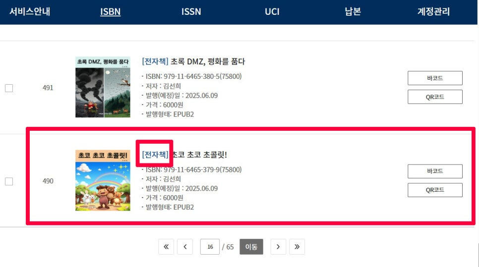 전자책 도서번호(ISBN)밖에는 받지 않았다. 출판사외에는 이를 발급할수 없다 법이다.
