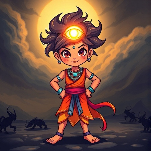 어느 날, 마을을 위협하는 악의 세력이 나타났고, 시바는 처음으로 자신의 능력으로 문제를 해결해야 했습니다. 깊은 명상과 수련을 통해 세 번째 눈을 갖게 된 그는 진실을 보고 악을 꿰뚫는 힘을 가지게 되었어요. 세 번째 눈의 힘으로 작은 악마의 장난을 막고, 강력한 위기에도 마을을 지켜냈답니다.