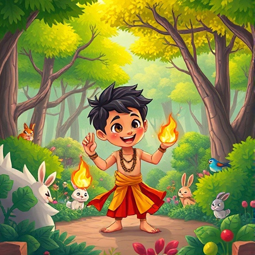 어린 시바는 산 속에서 작은 불꽃과 바람을 가지고 장난을 치며 놀았어요. 나무 위로 바람을 일으켜 잎사귀를 흔들고, 작은 불꽃으로 동물들을 놀라게 하는 장면은 친구들에게 웃음을 주었죠. 그러나 시바는 점점 자신의 힘이 단순한 장난이 아니라, 중요한 책임과 연결되어 있음을 깨닫기 시작했어요. 장난 속에서도 올바른 선택이 필요하다는 것을 배우게 된 것이죠.
