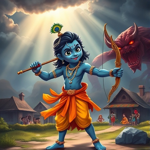 강력한 악마가 마을을 위협하지만, 크리슈나가 지혜와 용기로 모두를 구하는 장면.