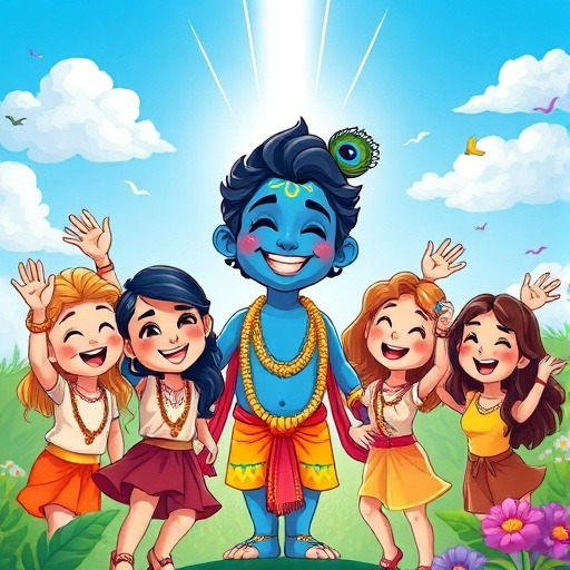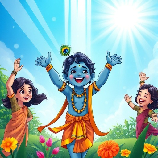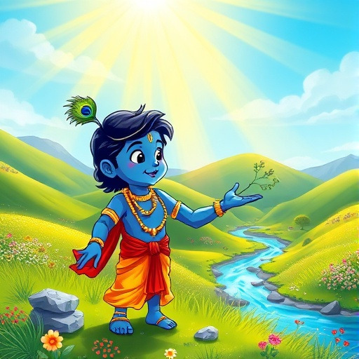 어느 날, 크리슈나는 물을 거슬러 오르는 기적을 경험했어요. 하늘에서 빛이 내려와 그의 몸을 감싸며, 작은 손짓으로 큰 돌과 나무를 움직이는 능력을 보여주었죠. 친구들은 놀라워하며 박수를 보냈고, 크리슈나는 자신이 단순한 소년이 아니라, 신의 능력을 지닌 특별한 존재임을 깨닫게 되었답니다.