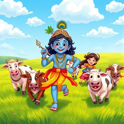 크리슈나는 친구들과 함께 소를 몰며 숲과 들판을 달렸어요. 작은 돌을 뛰어넘고, 시냇물을 건너며 소들을 이끄는 모습은 아주 씩씩했죠. 친구들은 크리슈나를 따라하며 모험심과 협력의 중요성을 배우기 시작했어요. 하루 종일 뛰고 달린 뒤, 크리슈나는 친구들에게 작은 이야기와 장난을 들려주며 웃음을 나누었답니다. 이렇게 크리슈나는 마을 사람들과 친구들에게 기쁨과 즐거움을 주며, 모험의 즐거움을 배웠어요.