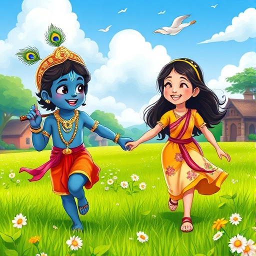 크리슈나는 친구 마을의 소녀와 처음 만나 서로 도와주며 친해졌어요. 함께 나무 열매를 따고, 작은 장난을 치면서 우정을 쌓았죠. 소년과 소녀는 서로의 장점을 알아가고, 배려와 신뢰가 무엇인지 배웠어요. 이렇게 크리슈나는 단순한 모험뿐만 아니라, 사람들과의 관계 속에서 사랑과 우정을 배우게 되었답니다.