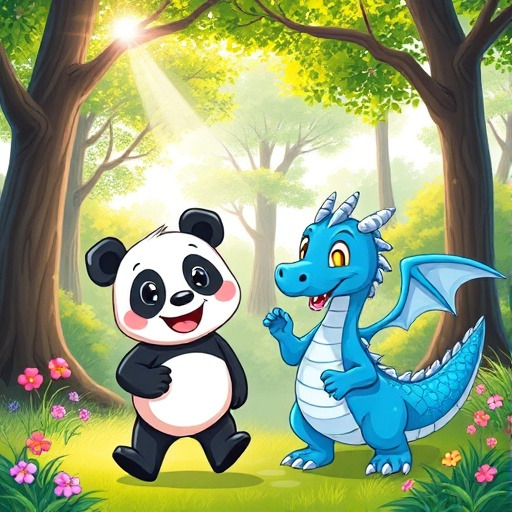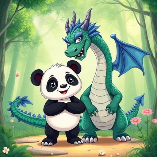 전설 속의 용이 어느 날 숲에 나타났어요. 동물들은 무서워했지만, 판다는 용에게 다가가 말을 걸었지요. 용은 판다의 용감함과 친절함에 감동해 친구가 되어주었답니다. 그 뒤로 판다와 용은 숲을 지키며, 어려움에 처한 친구들을 도와주었어요.