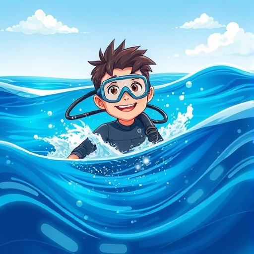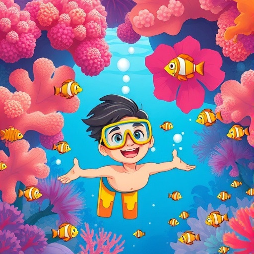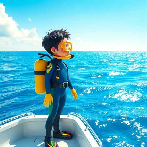 재우는 동안, 바다는 잔잔하게 출렁거렸어요. 재우는 스킨스쿠버 장비를 갖추고 작은 보트를 타고 바다 위로 떠났습니다. 물결 사이로 반짝이는 햇살, 멀리서 흔들리는 파도, 그리고 수면 아래서 반짝이는 물고기들의 빛깔이 신기했어요.