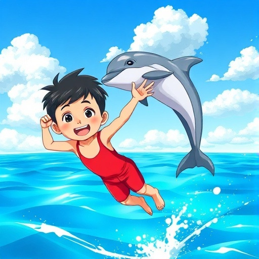 재우가 헤엄치자 돌고래들이 나타나 함께 물 위로 점프하고 춤추듯 헤엄쳤어요. 재우도 손을 흔들며 함께 놀았습니다. 물방울이 반짝이며 둘의 우정이 시작되었어요.