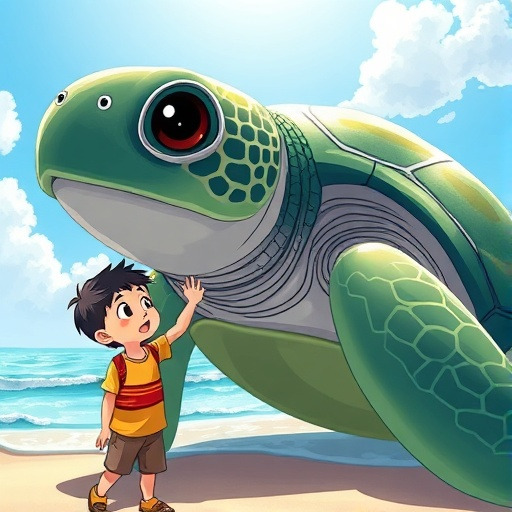 재우 앞에 거대한 바다거북이 나타났어요. 천천히 다가오는 거북이의 눈은 친근하게 반짝였습니다. 재우는 거북의 등을 살짝 만지며 친구가 되었어요. 거북과 함께 천천히 바다를 여행했답니다.