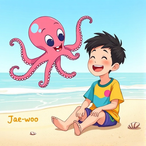 갑자기 문어 한 마리가 나타나 재우를 향해 팔을 늘리며 장난을 쳤어요. 문어는 색을 바꾸며 숨기도 하고, 재우는 물속에서 깜짝 놀라기도 했답니다. 결국 재우는 웃으며 문어와 친구가 되었어요.