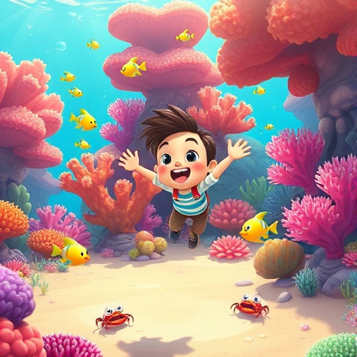 알록달록 산호초 사이로 재우가 헤엄쳤어요. 산호 사이에는 빨강, 주황, 보라색 물고기들이 춤을 추고 있었고, 작은 게들이 재우의 장화를 스쳐 지나갔습니다. 산호초 마을은 마치 작은 동화 속 세상 같았어요.