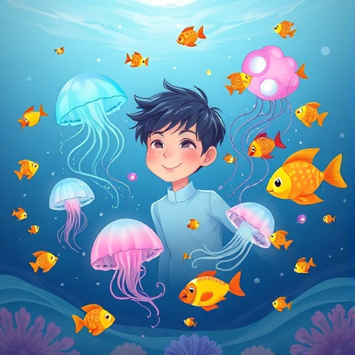 조금 더 깊이 내려가자, 바다는 어둡지만 신비로운 빛으로 가득했어요. 형형색색의 물고기와 해파리가 반짝이며 재우를 반겼습니다. 바다 속은 마치 별빛이 가득한 밤하늘 같았어요.