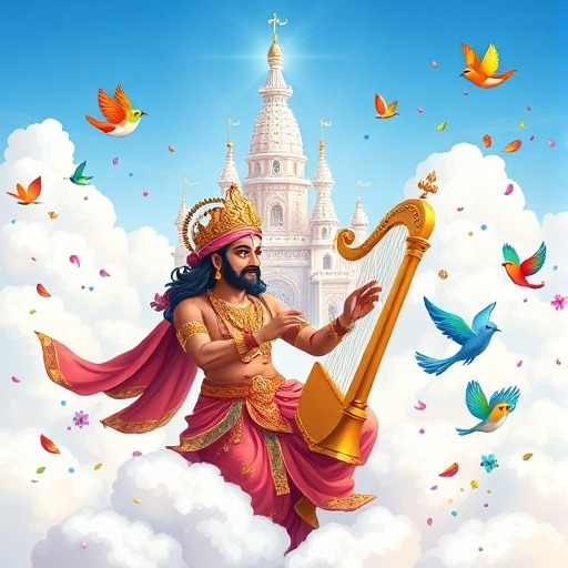 간다르바 왕의 가장 소중한 보물은 ‘황금 하프’였어요. 이 하프는 하늘의 별빛으로 만들어졌고, 한 줄 한 줄마다 바람의 소리를 담고 있었지요.