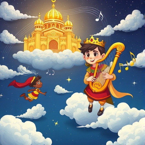 하프가 다시 울리자, 왕과 아누의 음악이 하나 되어 세상으로 퍼져나갔답니다.