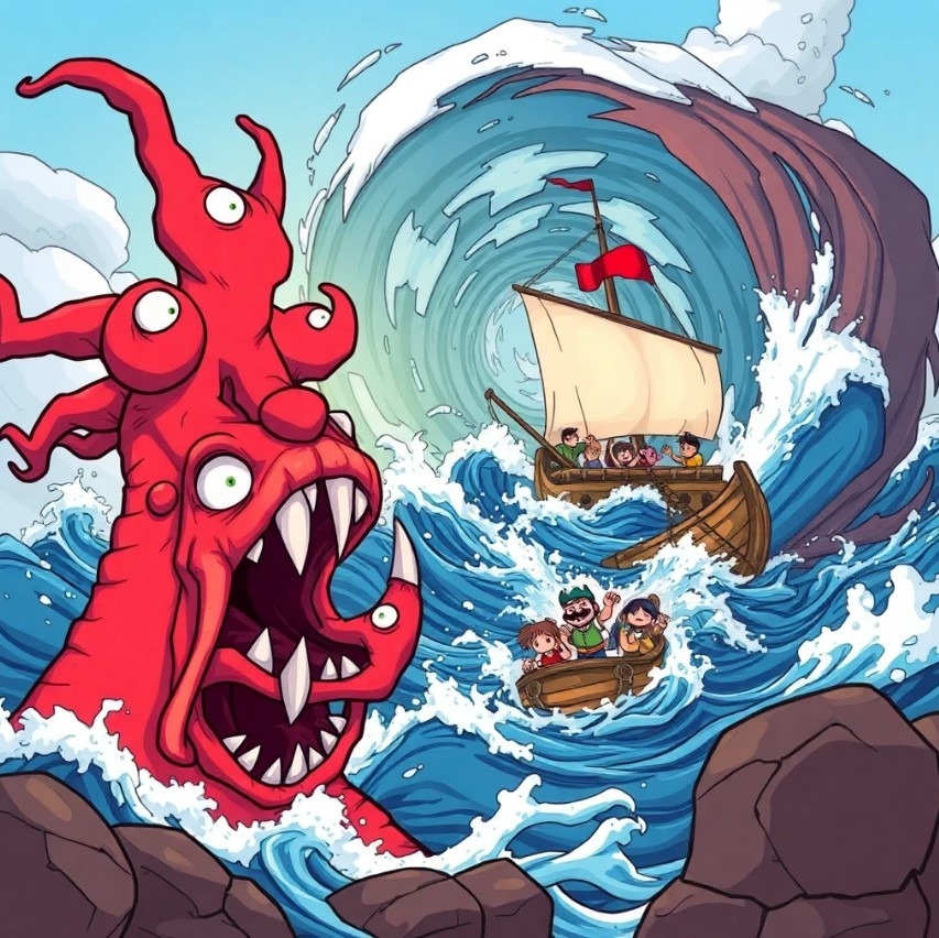 오디세우스는 두 개의 괴물, 스킬라와 카르리브디스를 지나야 해요. 스킬라는 여러 개의 머리를 가진 괴물이고, 카르리브디스는 큰 소용돌이를 만들어 배를 삼켜버리죠. 오디세우스는 지혜를 발휘해 큰 위기를 넘깁니다.