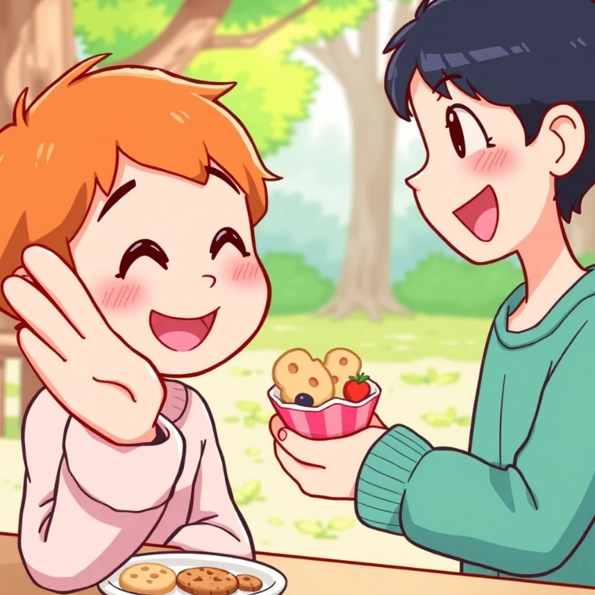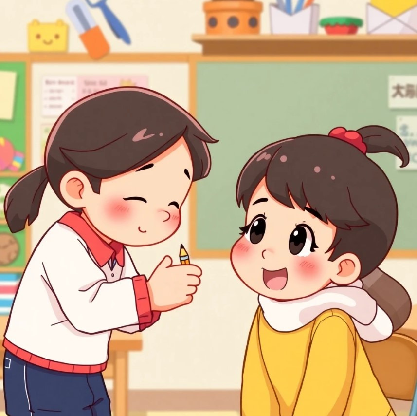 손이는 무섭고 떨리지만, 친구에게 연필을 돌려주기로 결심해요. “이거... 미안해. 다시 줄게.” 친구는 놀랐지만 웃으며 받아줘요.