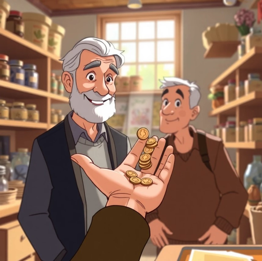 가게 아저씨에게 사과하며 사탕 값을 내는 손이.