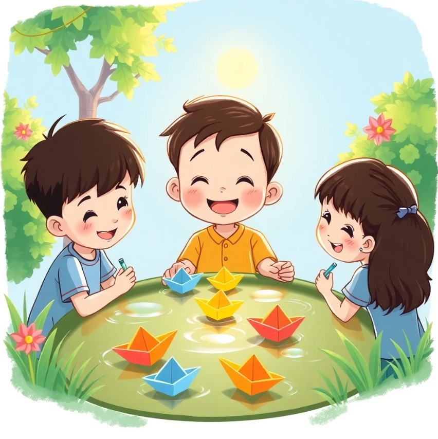 어느 날, 민수는 친구들과 함께 종이비둘기를 접어 연못에 띄운다.