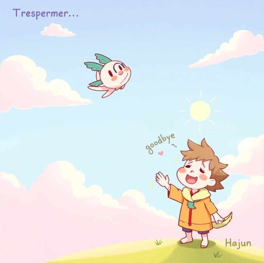 시간이 지나면서, 트레스퍼머는 하늘로 돌아가야 했어요. 하지만 하준은 알았죠. 로보 친구는 언제나 그의 마음속에 살아 있다는 걸. 트레스퍼머는 하준에게 마지막으로 말했어요.