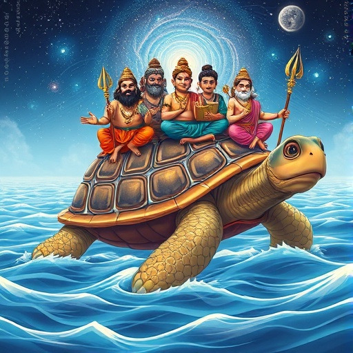비슈누는 거대한 거북 쿠르마로 환생해 바다 위에서 안정된 기반을 제공했죠.