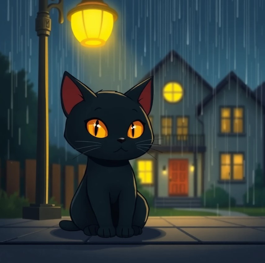 어느 날 밤, 천둥이 치는 날씨 속에서 주인공 ‘지우’는 문 앞에 앉아 있는 검은 고양이 한 마리를 발견해요.