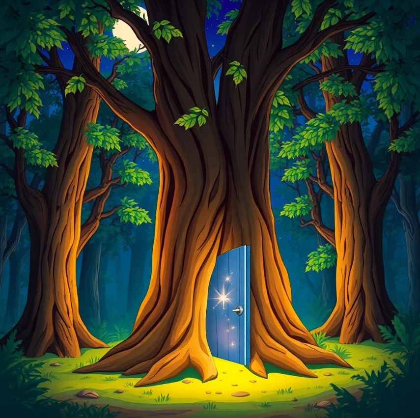 달이 가장 밝은 밤, 루루는 지우를 데리고 오래된 나무 아래 숨겨진 문으로 안내해요.