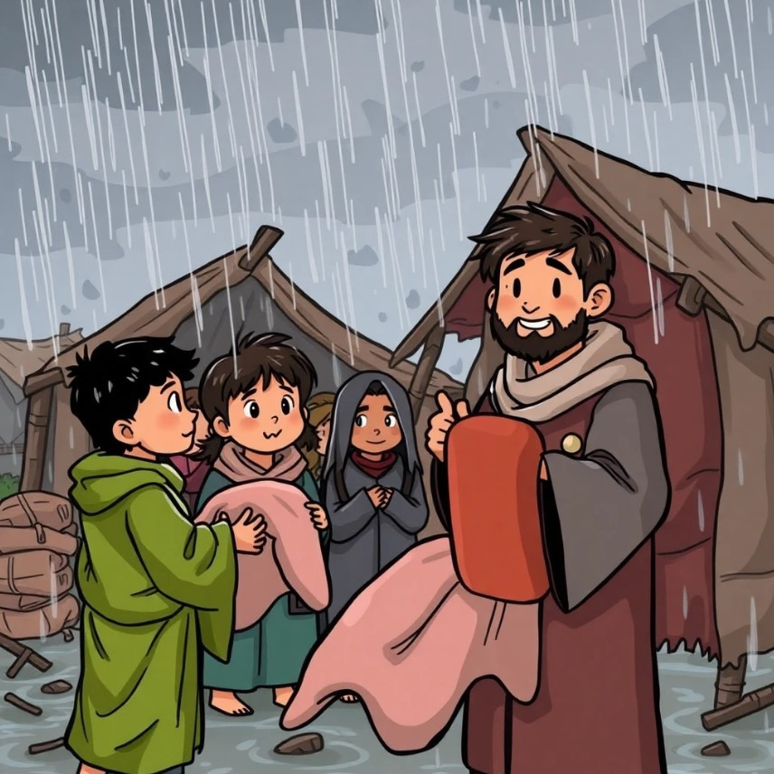 어느 날 마을에 큰 폭풍이 몰아쳤어요. 많은 사람들이 집을 잃고 힘든 상황에 처했죠. 마당쇠는 집이 없는 사람들을 위해 작은 대피소를 만들어주기로 결심합니다. 그는 자신이 가진 모든 것을 나누며, "진정한 지혜는 어려운 상황에서 어떻게 행동하느냐에 달려 있다"는 것을 깨달았습니다.