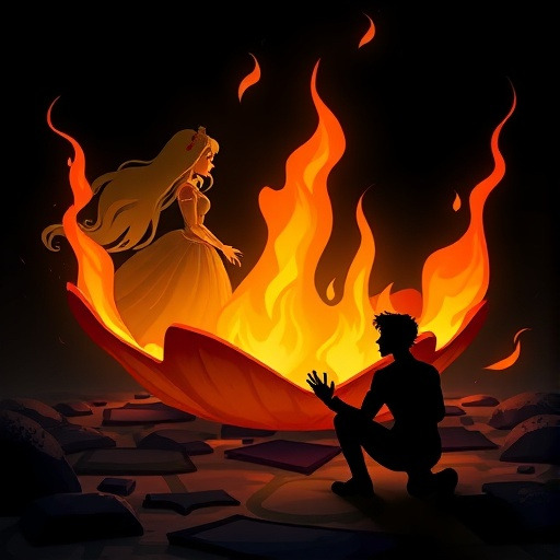 왕자는 여전히 개구리와 살고 있었지만 마음속엔 의문이 가득했어요. “밤마다 사라지는 이유가 뭘까?” 결국 왕자는 공주의 비밀을 알아내기 위해 개구리 껍질을 태워버렸어요. 하지만 불길이 사라지자 공주도 사라졌지요. “왜 그렇게 성급했나요…” 공주의 목소리가 바람에 섞여 들려왔어요. 왕자는 무릎을 꿇고 울었어요. “돌려줘요! 내 잘못이에요!” 왕자는 공주를 되찾기 위해 긴 여정을 떠나기로 결심했어요.