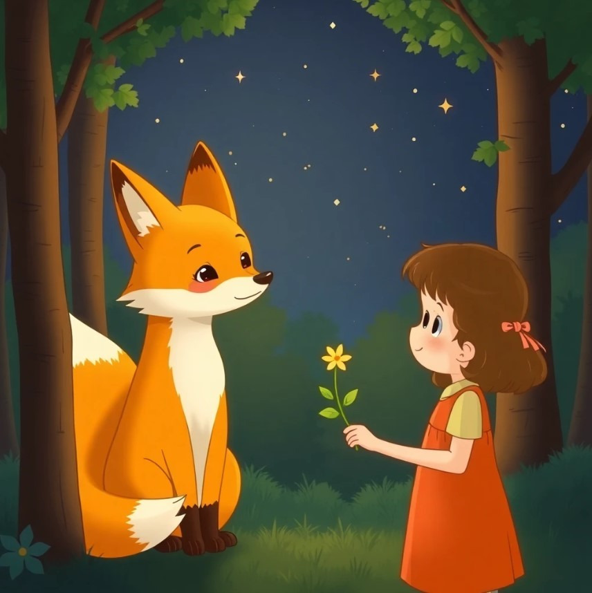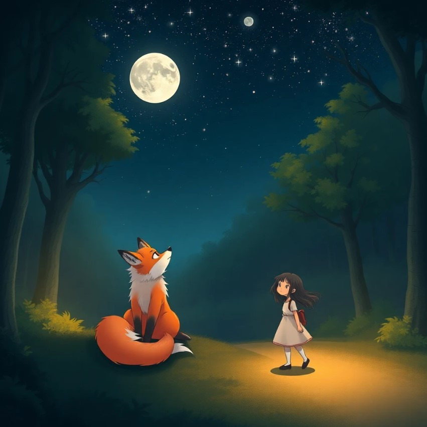 소녀는 울며 길을 찾다가 구미호를 발견하게 됩니다. 소녀는 겁먹지 않고 구미호에게 다가가 말했어요. "저… 도와줄 수 있어요?" 구미호는 놀랐지만, 소녀의 순수한 눈빛에 마음이 흔들렸습니다. 구미호는 소녀에게 길을 안내해주기로 결심합니다.