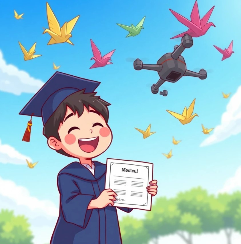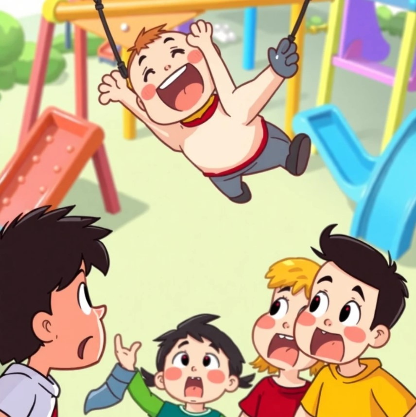 체육시간에 한 친구가 공중에 떠 있다가 마법이 풀려 떨어지려는 순간, 머털이는 용감하게 뛰어들어 구해요. 느리지만 단단한 도술이 모두를 놀라게 하죠.