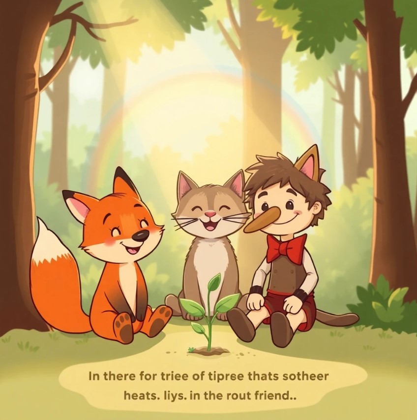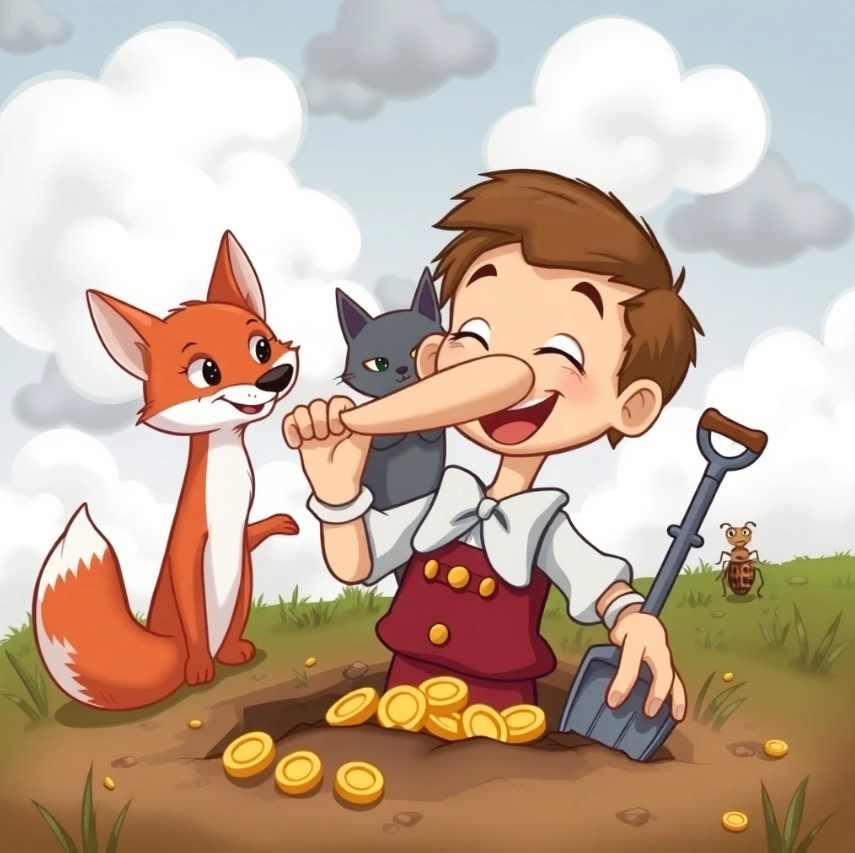 여우가 말했어요. “피노키오야, 그 금화… 그냥 쓰는 것보다 훨씬 더 늘릴 수 있어!”