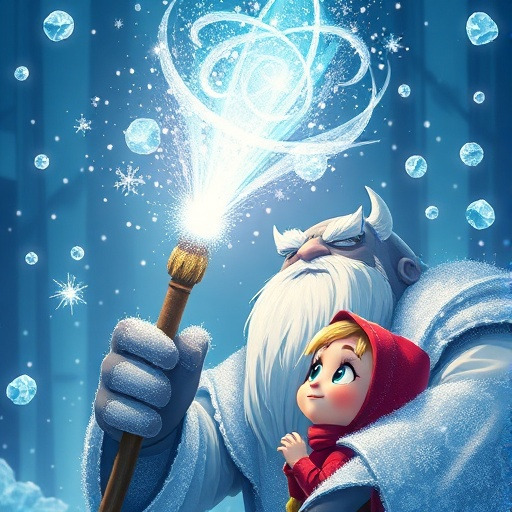 온몸이 하얀 눈꽃과 서리로 덮인 할아버지. 길고 풍성한 흰 수염은 땅에 닿을 듯했고, 그가 입은 푸른 외투에는 반짝이는 얼음 결정이 수놓아져 있었어요. 바로 겨울 요정, 모로즈코였습니다! 그는 지팡이 끝에 매달린 은빛 종소리를 울리며 땅 위를 성큼성큼 걸어왔어요. 모로즈코의 발걸음이 닿는 곳마다 서리가 피어오르고, 나무들은 더욱 두꺼운 얼음 옷을 입었지요. 모로즈코는 마샤 앞에 우뚝 서서, 얼음처럼 차갑지만 깊은 눈빛으로 마샤를 내려다보았습니다. 마샤는 두려웠지만, 꾹 참고 조용히 모로즈코를 바라보았어요.