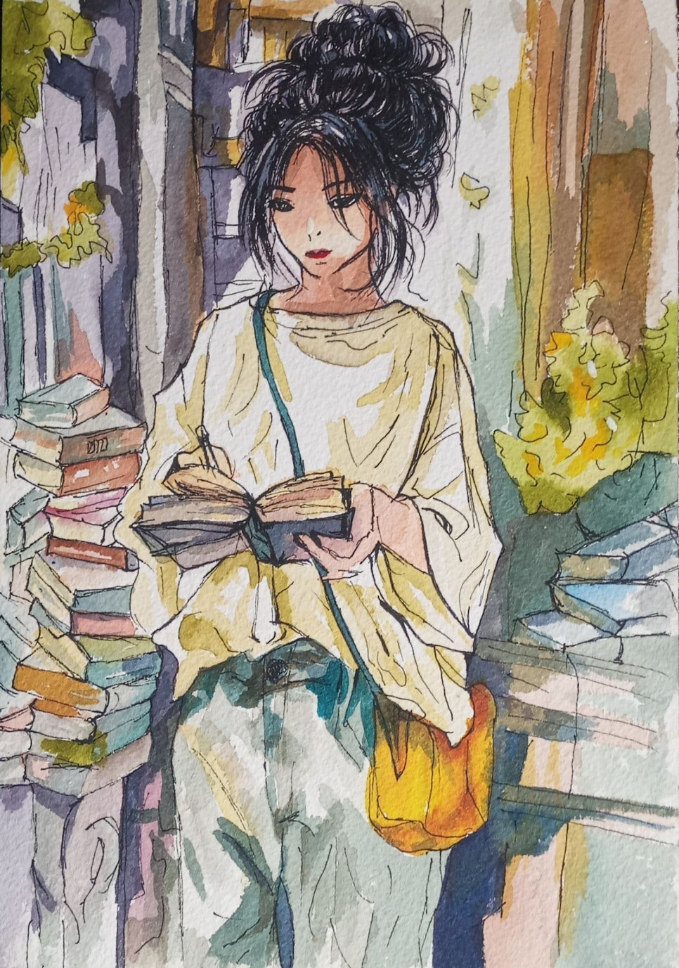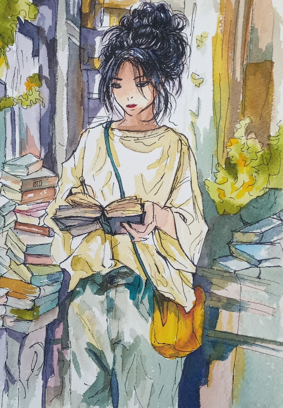 배경은 수채화 중심, 캐릭터는 펜 중심