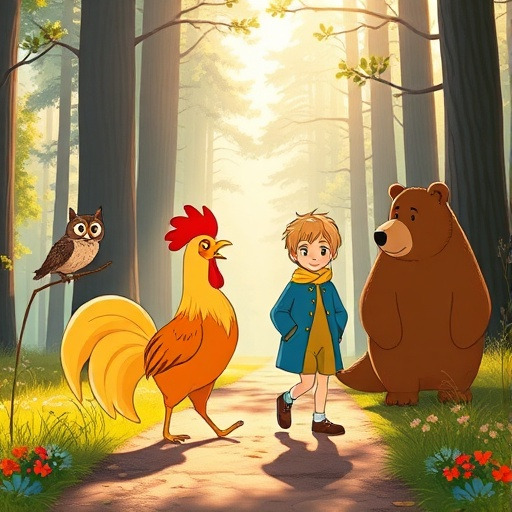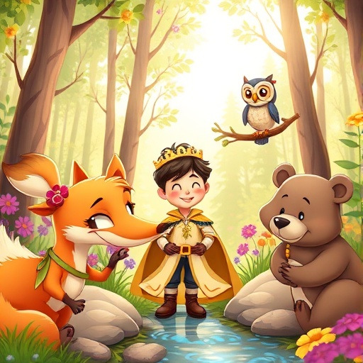 왕자는 길을 가던 중, 말을 하는 여우, 지혜로운 부엉이, 힘센 곰 등 동물 친구들을 만났습니다. 이들은 각각 자신의 능력으로 왕자를 도와주기로 했습니다. 여우는 길을 찾아주고, 부엉이는 예언의 숨겨진 의미를 풀어주며, 곰은 위험에서 왕자를 보호했습니다.