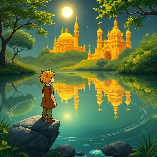 왕자는 마법사를 물리친 후, 연못 앞에 서게 되었습니다. 연못 속에 비친 자신의 모습과 왕국의 모습이 서로 겹쳐 보였고, 과거와 미래가 연결됨을 깨달았습니다. 연못은 황금 수닭의 마지막 예언을 보여주는 신비로운 힘이 있었습니다.