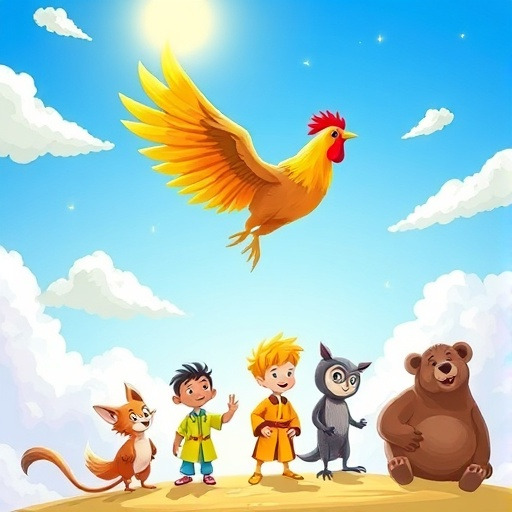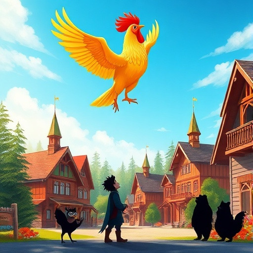 옛날 러시아의 작은 마을, 햇살이 반짝이는 어느 날, 사람들은 마당 한켠에서 황금빛 깃털을 가진 신비로운 수닭을 발견했습니다. 깃털이 햇빛을 받아 반짝이며 마치 보석처럼 빛났고, 수닭은 자신을 바라보는 사람들의 마음을 읽는 듯한 눈빛을 가지고 있었습니다. 마을 사람들은 두려움과 경이로움 속에서 수닭을 지켜보았습니다. 그 순간, 수닭이 깃털을 퍼덕이며 예언을 내렸습니다.