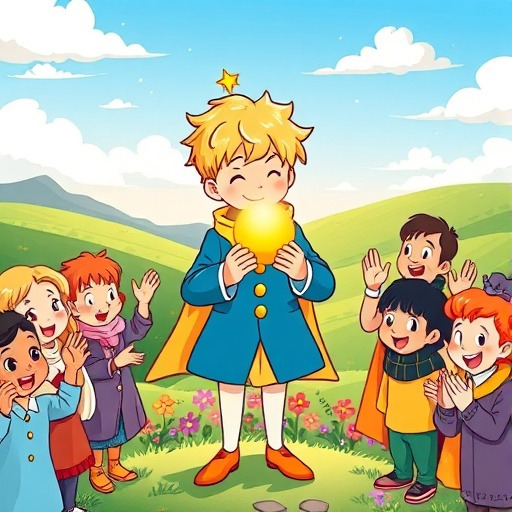 마지막으로 황금 수닭이 나타나 왕자와 친구들에게 축복을 내렸습니다. 황금빛 깃털이 하늘로 날아오르며, 왕국에 평화와 행복이 찾아왔습니다. 왕자는 이번 모험을 통해 진정한 용기, 우정, 사랑의 의미를 배웠습니다.