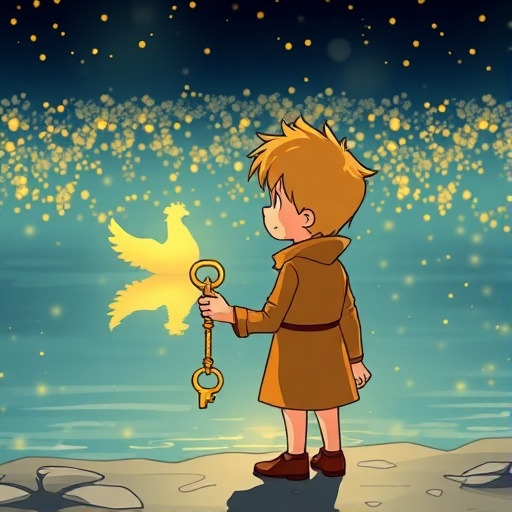 숲을 지나던 왕자는 황금 수닭이 남긴 황금 열쇠를 발견했습니다. 열쇠에는 신비로운 문양이 새겨져 있었고, 수닭이 준 예언의 마지막 문구와 연결되었습니다.