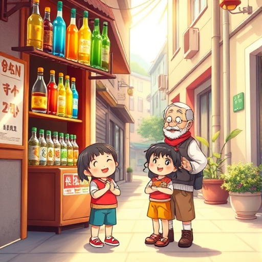 “이건 뭐지?” 마을 아이 민준이와 소희는 호기심에 가게 안으로 들어갔어요. 안에는 온갖 모양과 색깔의 병들이 줄지어 있었고, 장수 아저씨가 웃으며 말했어요.