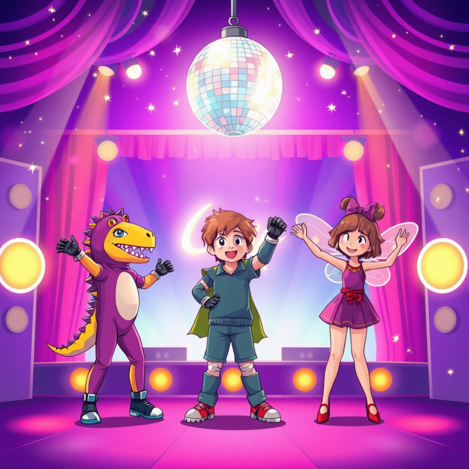 “쿵쿵! 콰앙!” 우렁찬 비트와 함께 ‘공룡 디스코’가 시작되었다. 아이들은 팔을 벌리고 다리를 크게 벌려 마치 티라노사우루스처럼 움직였다. 입으로는 ‘끼야아아!’ 소리를 내며 공룡이 된 듯 으르렁댔다. 몽이는 작은 공룡알 모양의 무대 소품을 들고 엉덩이를 흔들었다. 해별이는 앞발 흉내를 내며 목을 뒤로 젖혀 포효했고, 재이는 공룡 댄스를 하며 무대 한가운데를 휘저었다. 아이들은 신나게 뛰고 돌며 그 누구도 따라 할 수 없는 공룡춤을 완성했다. 무대가 울릴 만큼 발 구르는 소리가 컸고, 그건 곧 웃음소리로 바뀌었다.