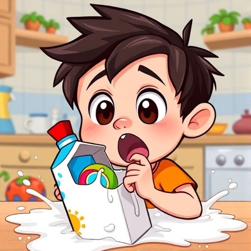 보리가 놀라 우유를 열어보니 작은 장난감이 떠 있었다.