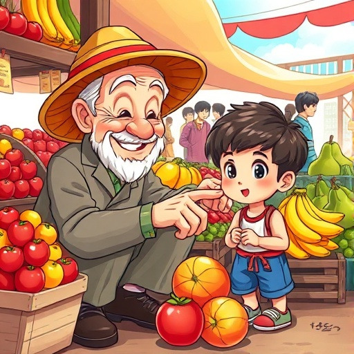시장 아저씨가 보리에게 안전하게 먹거리를 고르는 법을 알려준다(색, 냄새, 보관 상태 살피기).