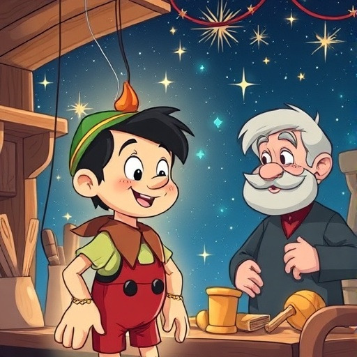 제페토는 언제나 혼자였지만, 따뜻한 마음으로 마을 아이들의 장난감을 만들어 주곤 했지요. 어느 겨울날, 제페토는 숲에서 이상하게 빛나는 통나무 하나를 발견했어요. 가까이 다가가자 통나무가 스르르 떨며 어린아이의 웃음소리를 냈어요.