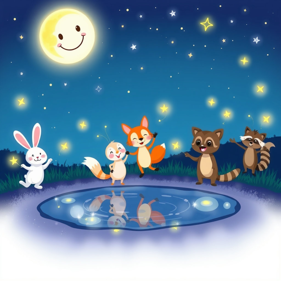 밤이 되자 별들이 총총 떠올랐어요. 부엉이는 조명 역할을 하고, 반딧불이들이 불빛을 날렸어요. 음악이 흐르고, 친구들은 별빛 아래에서 수영을 즐겼어요. 여름밤, 모두가 하나 되어 행복한 시간을 보냈어요.