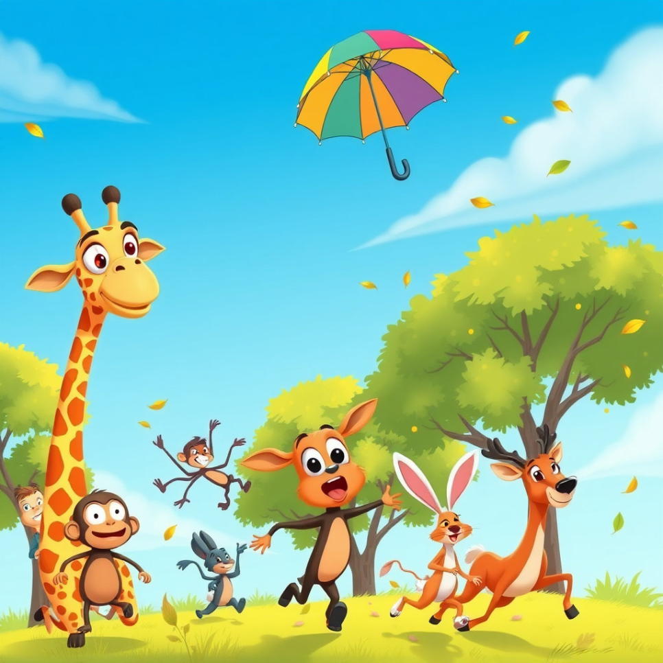 기린은 목을 보호하려고 엄청나게 큰 우산을 머리에 썼어요. 그런데 갑자기 바람이 훅! 불면서 우산이 하늘로 날아가 버렸지요. “내 우산~!” 기린은 우산을 쫓아 뛰고, 다람쥐는 나무를 타고, 새들은 날아올랐어요. 결국 작은 부엉이가 “여기요!” 하고 우산을 찾아주었답니다.