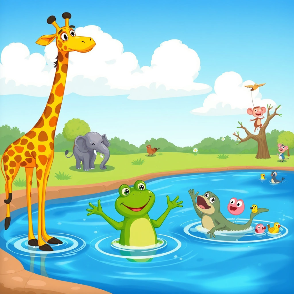 기린은 수영을 못 해서 걱정이었어요. 개구리는 기린을 위해 수영 교실을 열었어요. “먼저 발차기부터!” 기린은 두 발을 푸적푸적 움직이며 점점 익숙해졌어요. “나도 헤엄칠 수 있어!” 자신감을 얻은 기린은 기뻐서 하늘을 향해 외쳤어요.