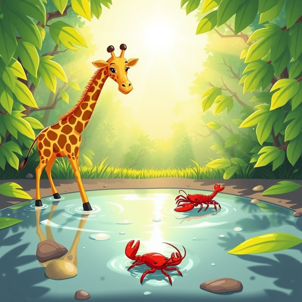 밤사이 쏟아진 소나기로 숲속에는 큰 물웅덩이가 생겼어요. 기린은 목을 휘저으며 살짝 물에 발을 담가보고는 깜짝 놀랐어요. “우와, 시원해!” 가재는 그 안에서 팔딱팔딱 뛰며 말했죠. “이건 완전 여름 수영장이야!” 두 친구는 손뼉을 치며 여름 물놀이 계획을 세우기 시작했어요. "이곳을 우리만의 놀이터로 만들자!"