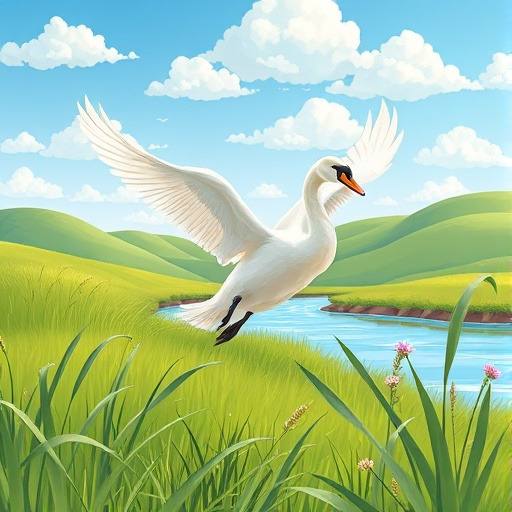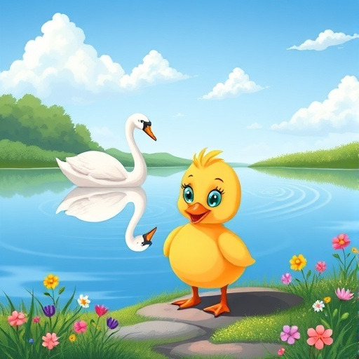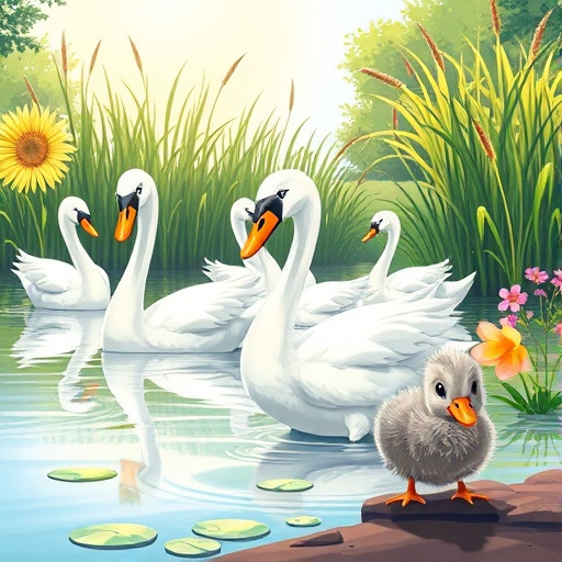 어느 날, 아기는 호숫가에서 반짝이는 깃털을 가진 새 무리를 보았어요. 그들은 우아하게 호수 위를 미끄러지듯 움직였지요.